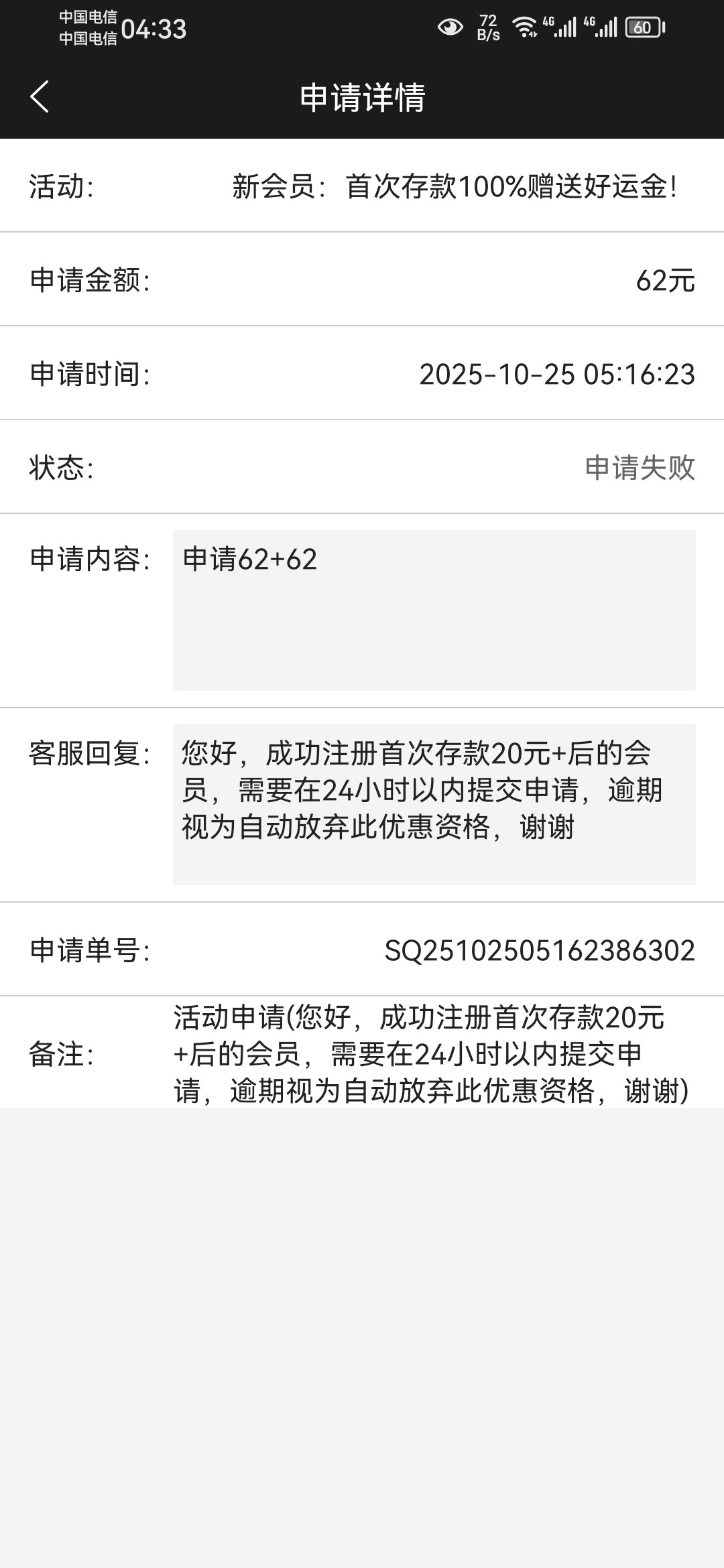 本来说充62送62,也没给送,62一毛没给,后面8块打到300多,提现200不给提,说是彩金5倍流水,彩金5倍流水让打1000流水